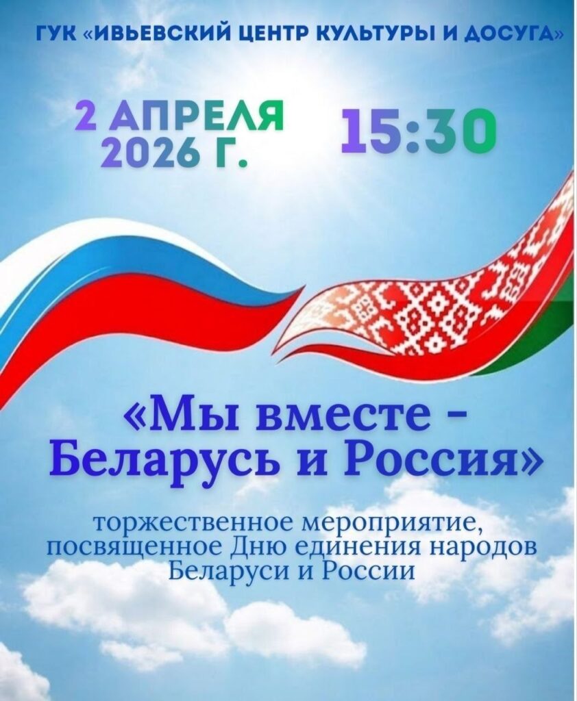 2 апреля в Ивьевском центре культуры и досуга пройдет торжественное мероприятие “Мы вместе — Беларусь и Россия”, посвященное Дню единения народов Беларуси и России.