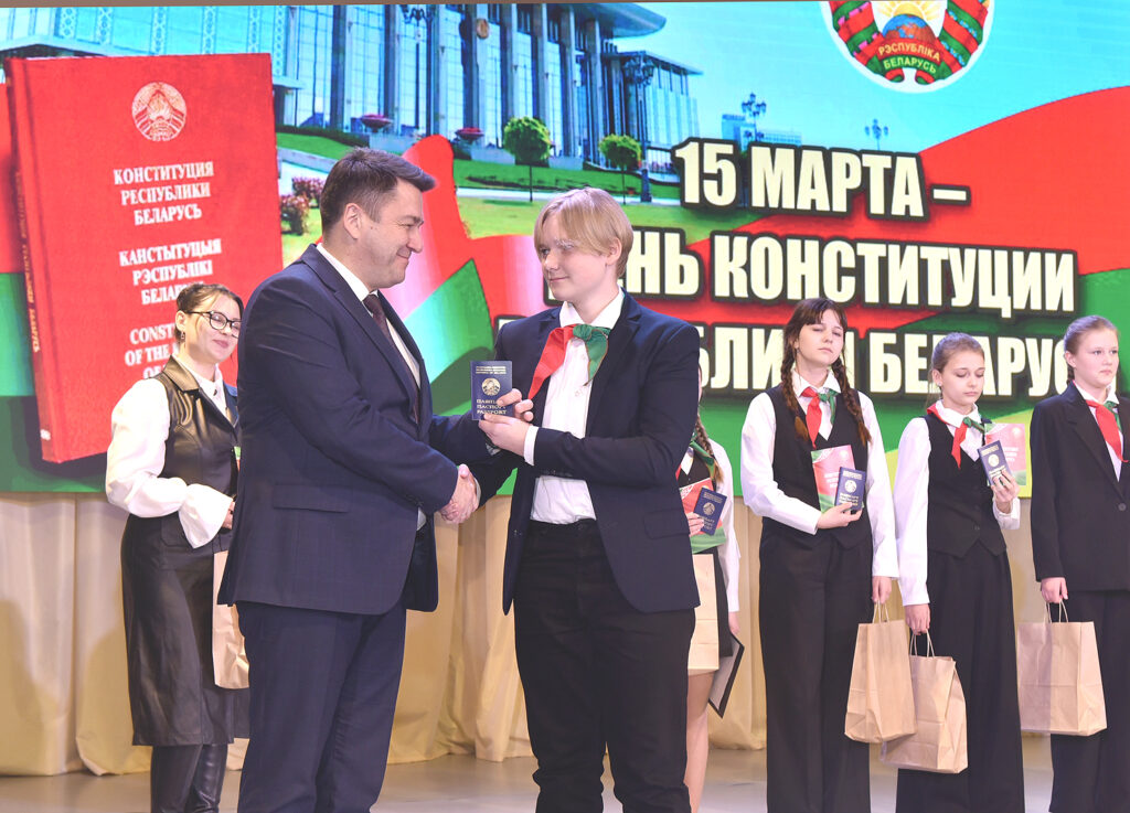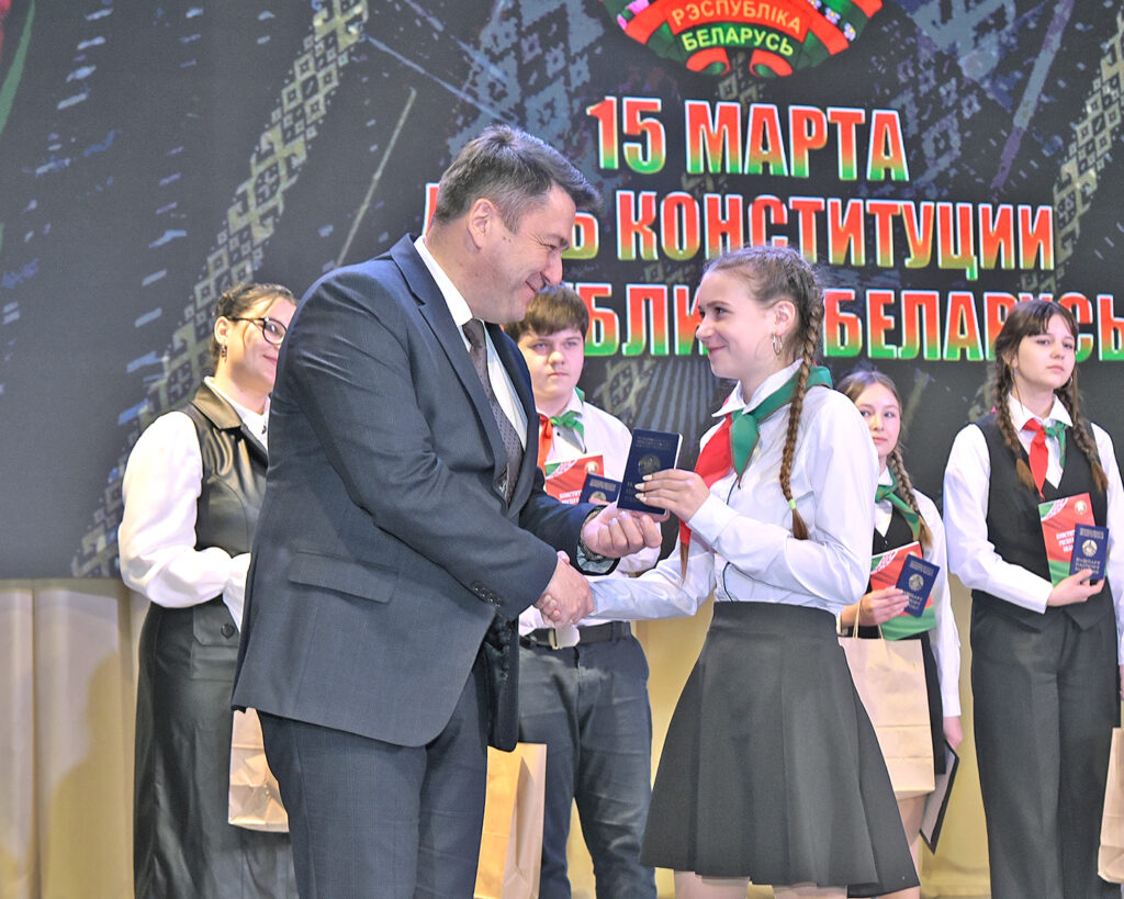 – В нашем государстве есть очень важные государственные праздники – их всего лишь шесть, и День Конституции один из важнейших из этих шести праздников. Сегодня мы присутствуем на торжественной церемонии вручения паспортов гражданина Республики Беларусь. Ваши родители, знакомые, близкие, взрослые, которые находятся здесь, получали паспорта другой страны. И я, будучи школьником, в 16 лет получал паспорт, он был красного цвета, но для меня это была высочайшая гордость, за то что я присоединился к огромному коллективу единомышленников, друзей и товарищей, всем жителям Советского Союза. К сожалению, так случилось, в силу исторических событий, эта страна перестала существовать, но Республика Беларусь обрела суверенитет и независимость. И вот Конституция Республики Беларусь в 1994 году стала гарантом защиты прав каждого из нас. Уже будучи взрослым, я не так уж и сожалел, что мне пришлось сменить красный паспорт на синий. И вот этот синий паспорт – он для меня очень дорог. И всегда, открывая его, я могу вспомнить все этапы строительства нашего государства. Я могу вспомнить, как мы переживали сложные для нашей страны периоды, когда мы дружили, и не дружили, когда нас пытались нагнуть, но мы несгибаемы, когда пытались отобрать у нас суверенитет и независимость, но этого не случилось. Только по одной причине — мы все белорусы, мы все граждане и мы горячо любим свою Родину и защищаем ее. Не с оружием в руках, а многие сделали именно так, защищая рубежи нашего государства, защищая порядок нашего государства, но силой духа и верой мы сохранили и продолжаем развивать наше государство, — сказал заместитель председателя Гродненского облисполкома.