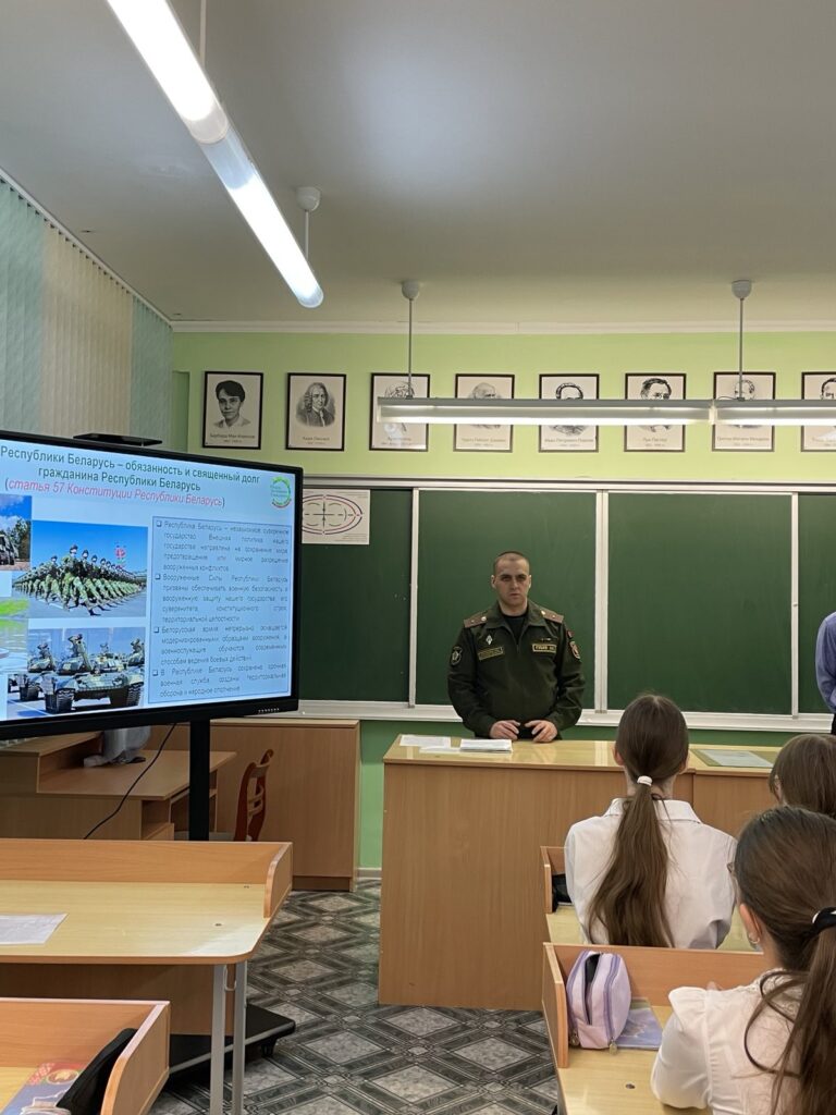 Учащиеся актуализировали знания о защите государственной границы Республики Беларусь, о Вооруженных Силах Беларуси как гаранте национальной безопасности страны, о военной службе как школе школе мужества, об учебных заведениях, готовящих военных специалистов, о роли военно-патриотических клубов в патриотическом воспитании молодежи.