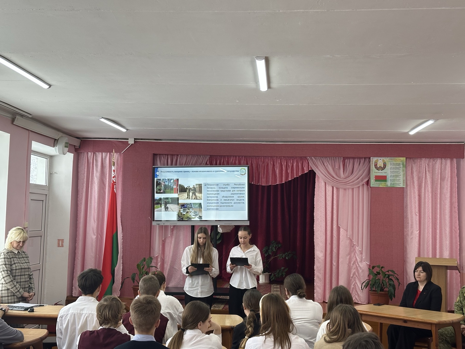 Особое внимание на мероприятии уделялось диалогу. Учащиеся не просто слушали, но и активно участвовали в обсуждении, задавали вопросы, высказывали свои мнения. Важным элементом стало выступление приглашенного гостя – Войтеховского Евгения Юрьевича, прапорщика пограничной заставы агрогородка Геранены, которое прошло с использованием формата телевизионного проекта «100 вопросов взрослому». Евгений Юрьевич на своем примере показал, что значит быть настоящим защитником Отечества. Живые истории, воспоминания и наставления произвели на ребят глубокое впечатление, сделав тему более осязаемой и личной.