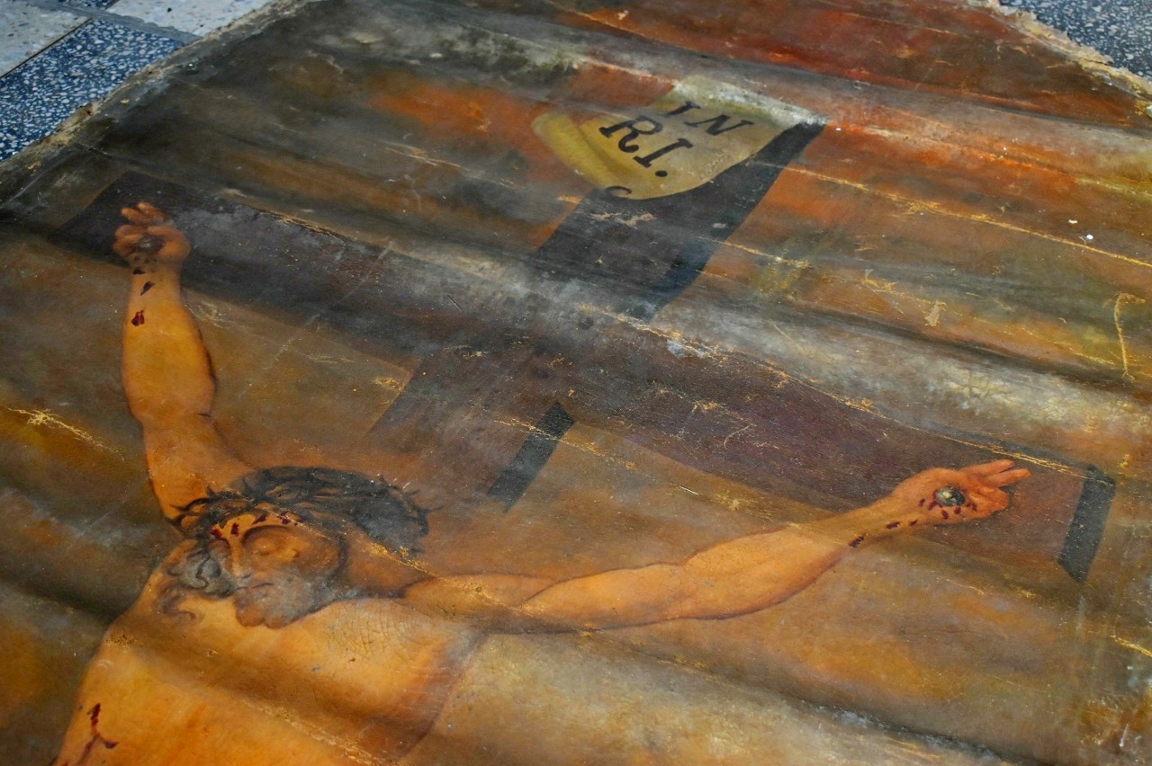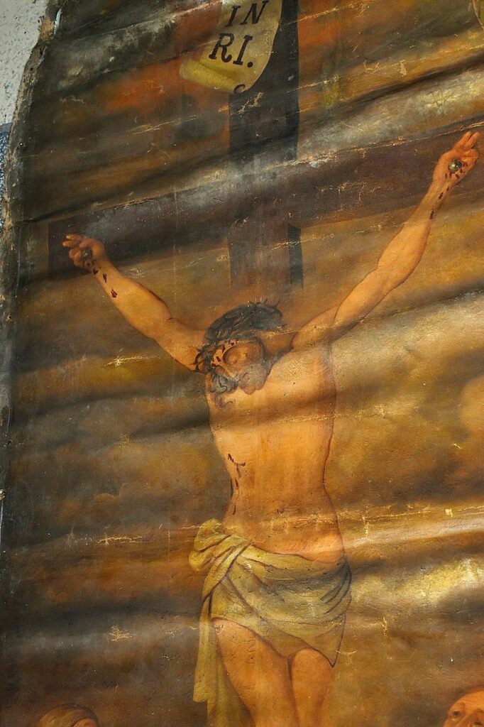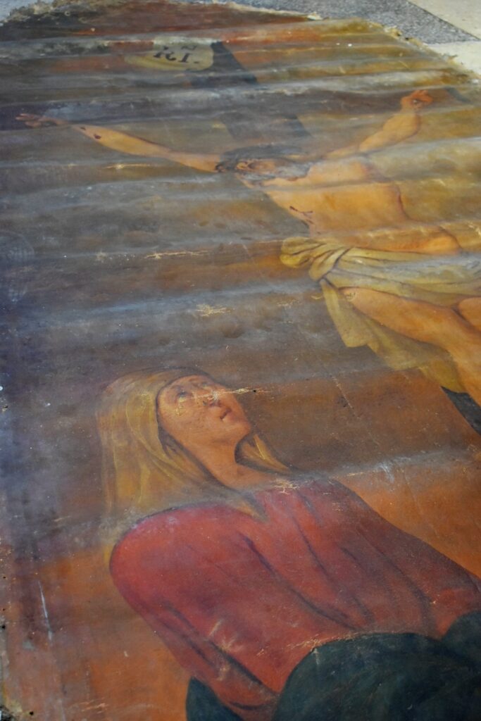 Архіўны дакумент, які трапіў мне ў рукі, сцвярджае, што галоўны алтар нашага касцёла калісьці меў крыху іншы выгляд. “Акт візіту Касцёла і Кляштара айцоў Бернардынаў іўеўскіх” ад 19 снежня 1844 года, які захоўваецца ў бібліятэцы Вільнюскага ўніверсітэта, гаворыць, што ў цэнтральнай нішы замест вялікага драўлянага крыжа знаходзіўся абраз Укрыжавання Пана першай паловы ХІХ ст. На палатне алеем намаляваны распяты Езус, пад крыжам стаяць Яго Маці і святы Ян, тут жа на каленях — святая Марыя Магдалена. Даўжыня гэтага палатна складае 405 сантыметраў, а шырыня 150, што робіць яго самым вялікім абразом у касцёле.