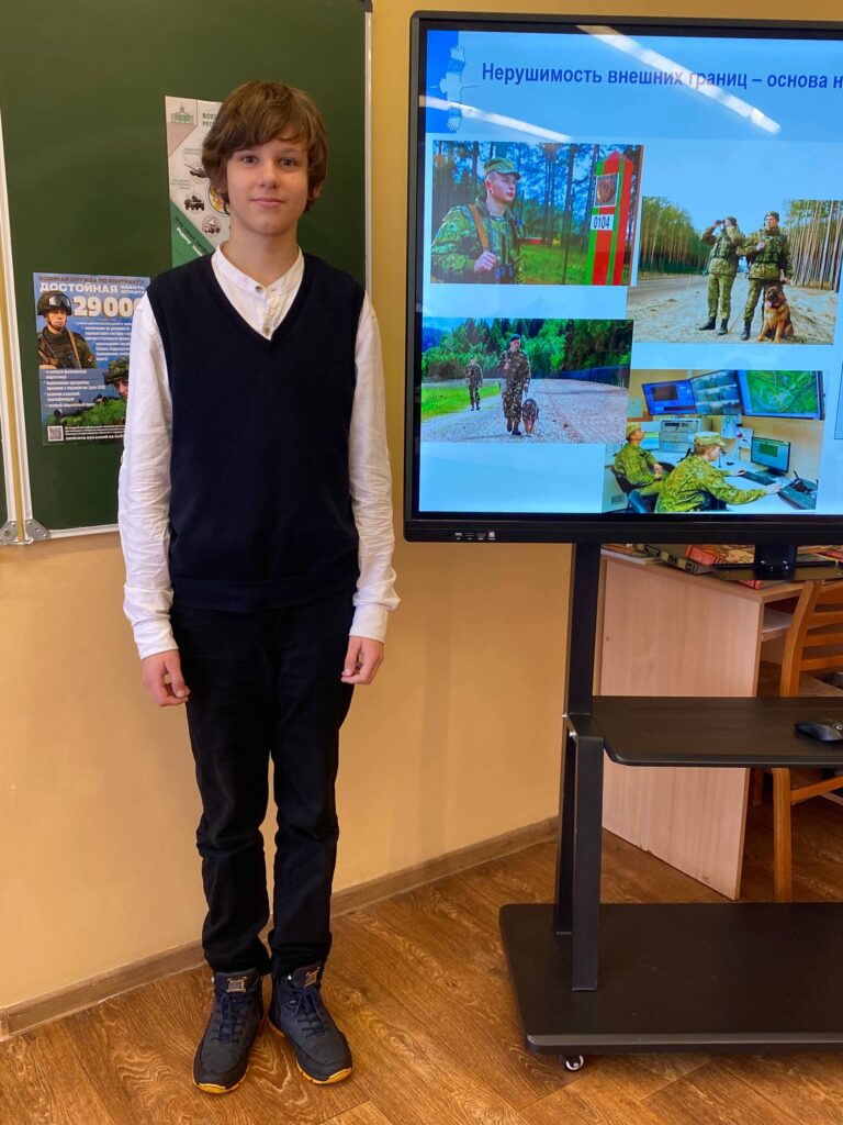 На первом этапе учащиеся 8–11 классов познакомились с информационными материалами о Вооружённых Силах Республики Беларусь, системе военного образования, роли пограничной службы и деятельности военно‑патриотических клубов. Ребята обсудили, почему мир является безусловной ценностью и какие задачи стоят перед армией в современных условиях.