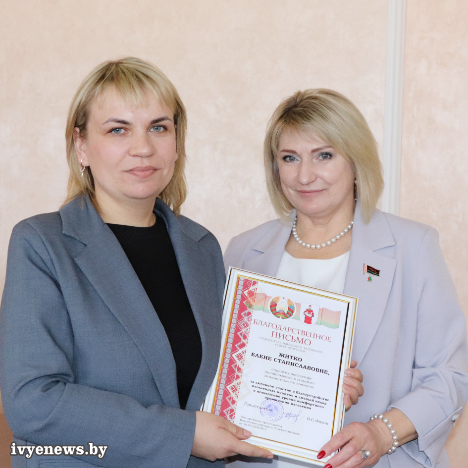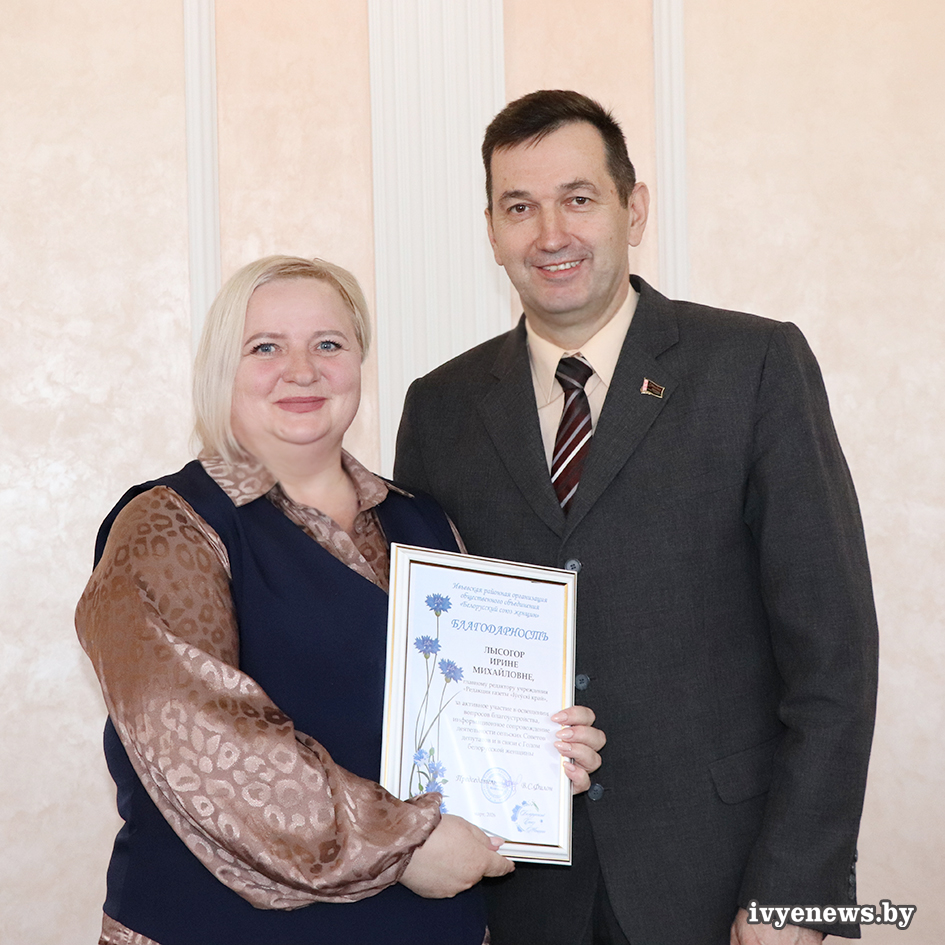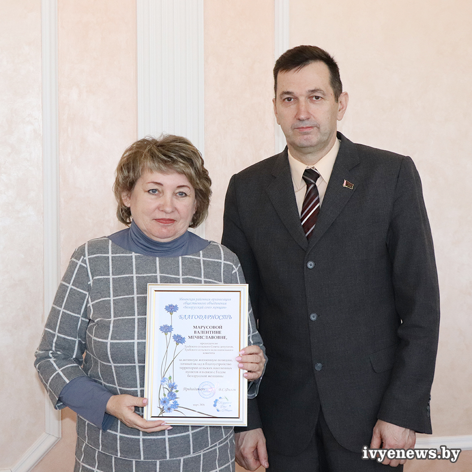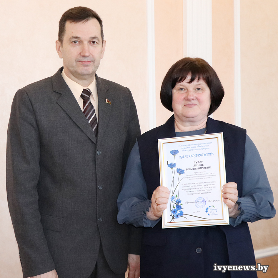 Председатели сельсоветов района Янина Бузар, Таисия Лось, Валентина Марусова и Марина Алехнович получили благодарности Ивьевской районной организации БСЖ за активную жизненную позицию, личный вклад в благоустройство территорий сельских населенных пунктов и в связи с Годом Белорусской женщины;  главный редактор учреждения «Редакция газеты «Іўеўскі край» Ирина Лысогор была награждена за активное участие в освещении вопросов благоустройства, информационное сопровождение деятельности сельских Советов депутатов.