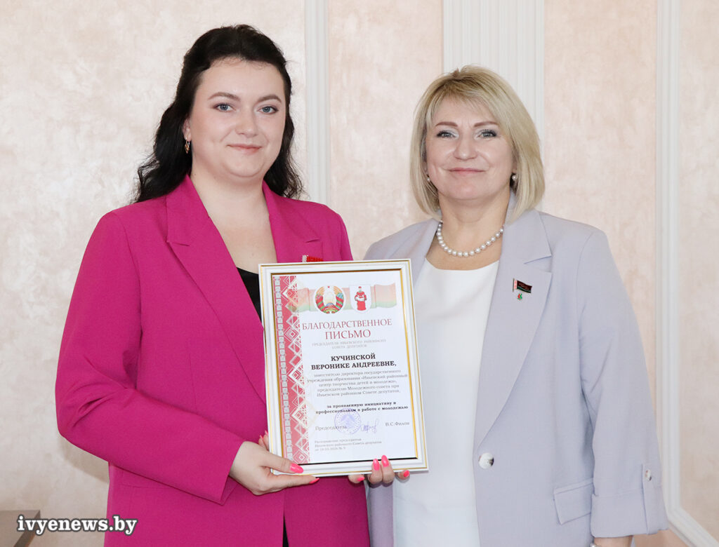 За проявленную инициативу и профессионализм в работе с молодежью награды получили заместитель директора государственного Ивьевского районного центра творчества детей и молодежи, председатель Молодежного совета при Ивьевском районном Совете депутатов Вероника Кучинская, депутат районного Совета, директор Юратишковской СШ Ольга Чесновская.