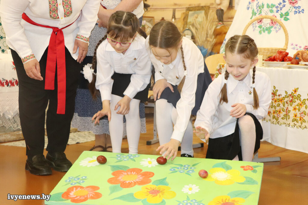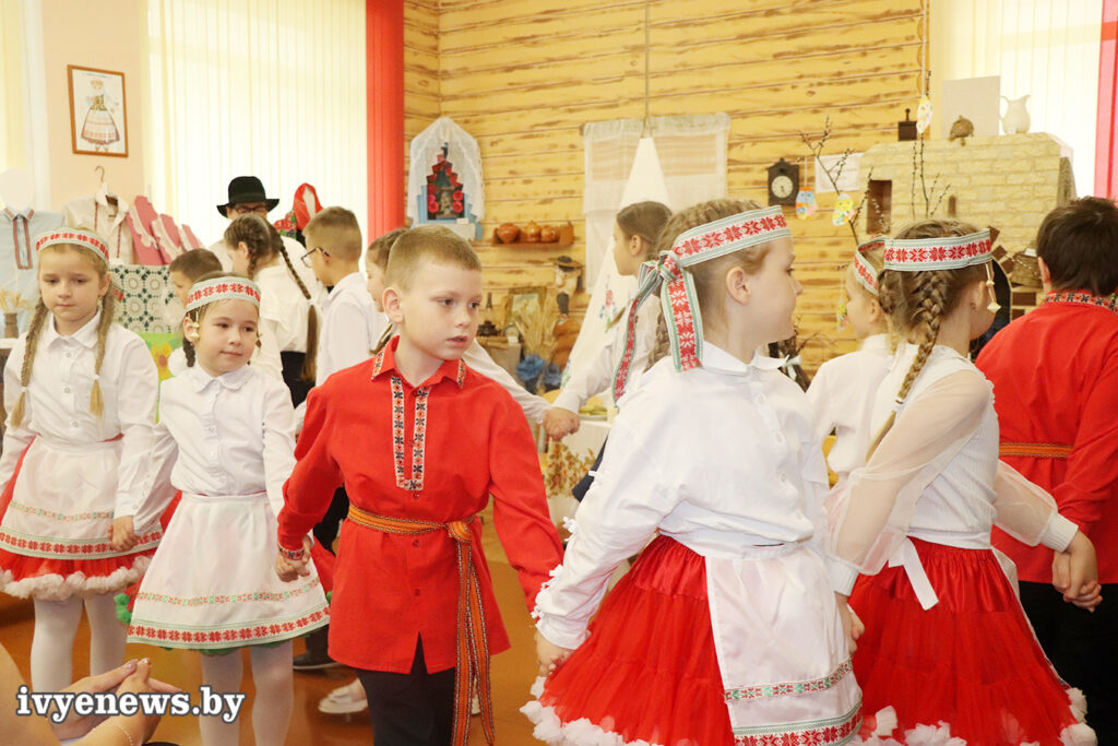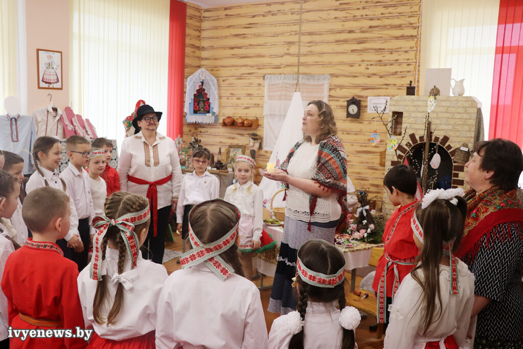 Гостей встретили в историко-этнографическом музее «Скарбы Бацькаўшчыны» Ивьевской начальной школы. Здесь для учеников вторых и третьих классов развернулось фольклорное представление с интригующим названием «Недалечка чырвонае яечка». Основная задача организаторов была не просто развлечь детей, а помочь им через игру проникнуться смыслами великого праздника Пасхи, или, как его здесь называют, Вялікадня.