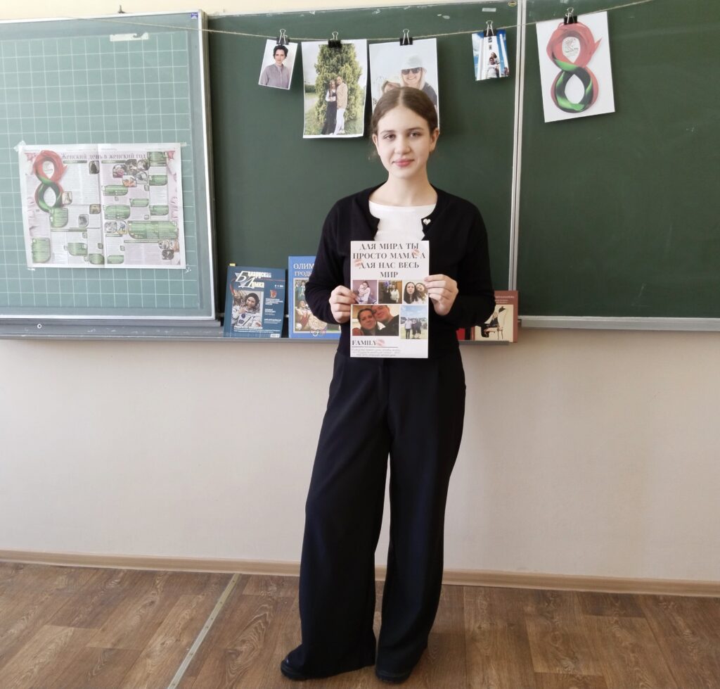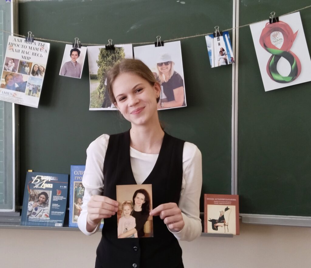 Разговор о роли женщины в судьбе страны ребята начали с самого сокровенного — образа Матери. Главным украшением класса стала творческая экспозиция «Линия жизни и гордости», где гимназисты представили портреты своих мам.