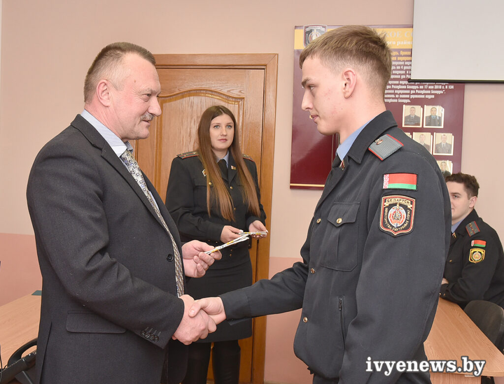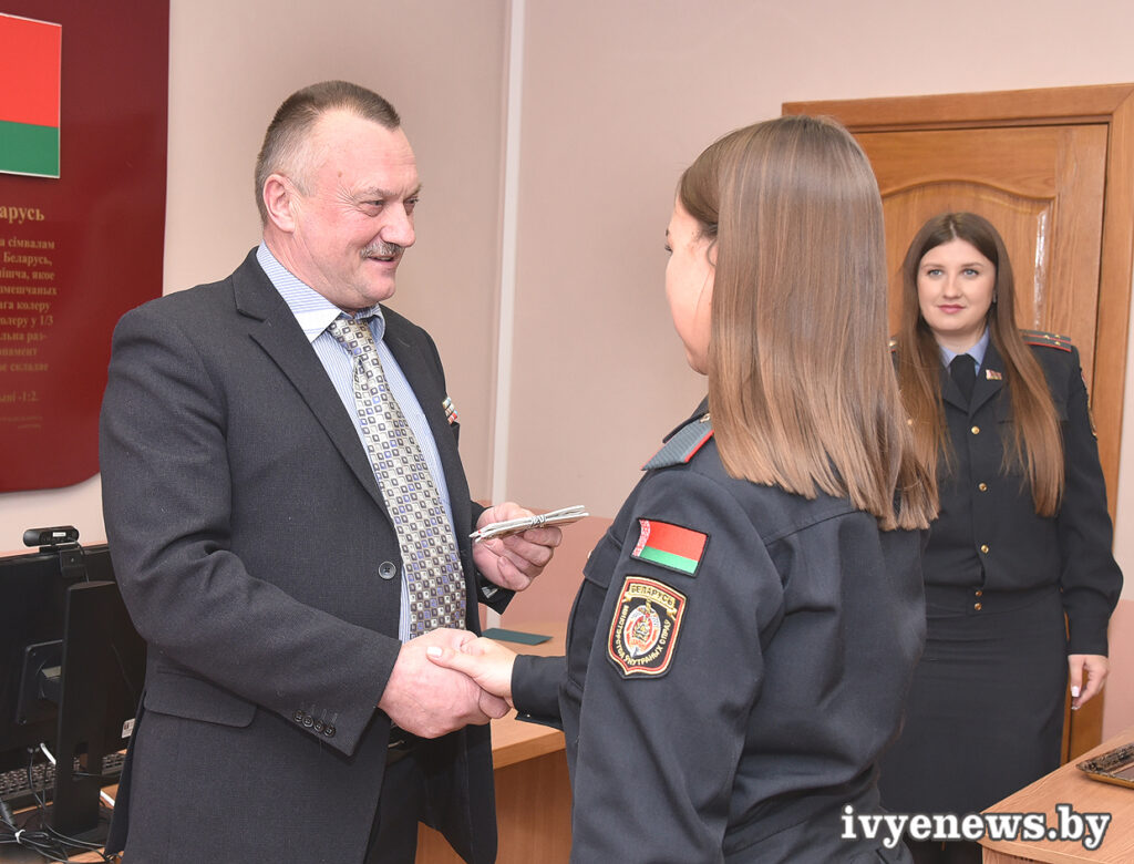 Кульминацией встречи стала церемония присвоения первых и очередных специальных званий. Особенно волнительным этот момент стал для Илоны Жебрик. Инспектор уголовно-исполнительной инспекции милиции общественной безопасности Ивьевского РОВД получила погоны младшего лейтенанта милиции. С напутственным словом и погонами в руках к ней обратился Виктор Юзефович Леонович, бывший работник ГАИ Ивьевского РОВД, заместитель председателя Ивьевской районной организации ОО “БСВВА”.