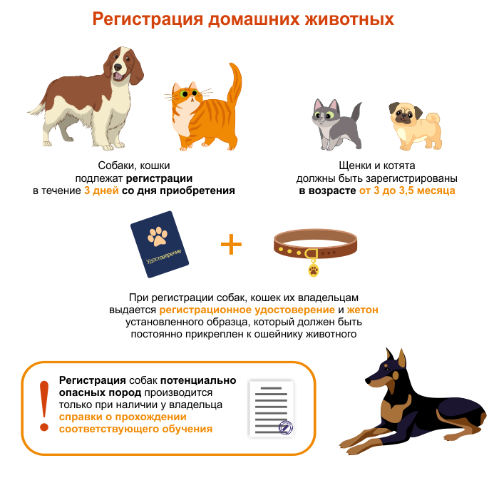 В соответствии с действующими правилами содержания домашних животных, собаки и кошки подлежат обязательной регистрации в местных исполнительных и распорядительных органах или уполномоченных организациях.