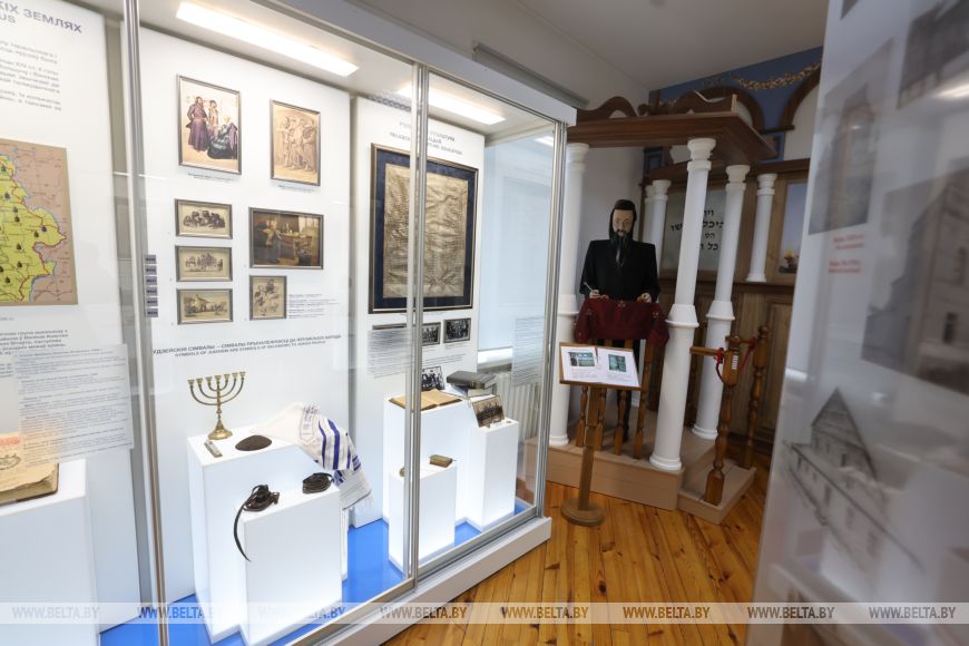 В зале, посвященном истории ивьевских иудеев, она также раскрывается с местным колоритом. Священная книга Тора, подсвечник менора, шарф для молитвы — талес, головной убор кипа, коробочки с молитвами — тфилины, футляр мезуза — вот далеко не полный список экспонатов. И — как же без переплетения культур — стены зала украшают всем нам знакомые вытинанки, вот только сюжеты в них — символические, еврейские.
