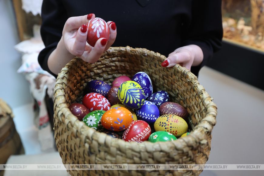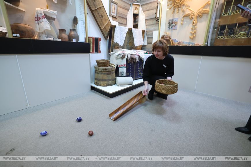Есть в этой местности и особенная праздничная забава с пасхальными яйцами. Традиционно ими бьются, такая игра здесь называется «мацанкай», от слова «моцны». А еще в ивьевских семьях катали крашеные яйца по желобу, стараясь попасть ими в другие, разложенные внизу. Директор с удовольствием показала забаву из собственного детства: получается что-то вроде похожее на бильярд, только в итоге победитель получает всю корзину сбитых им яиц.